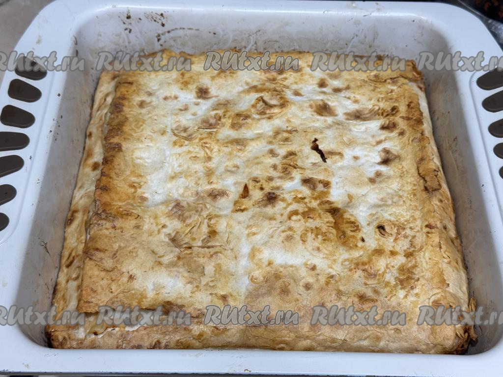 Выложить начинку из лаваша и капусты в форму, застеленную лавашами, равномерно распределить.