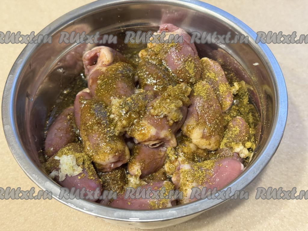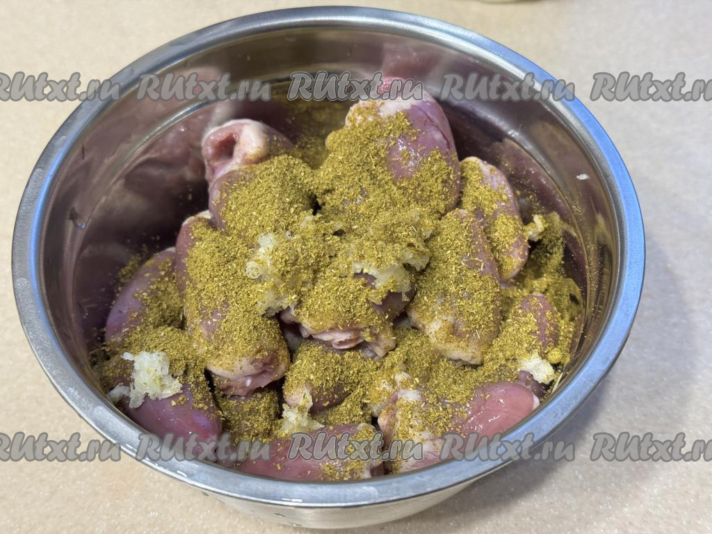 Подготовленные куриные сердечки выложить в достаточно глубокую миску, добавить специи (в качестве специй я использовала 0,5 чайной ложки хмели-сунели) и пропущенный через пресс чеснок.