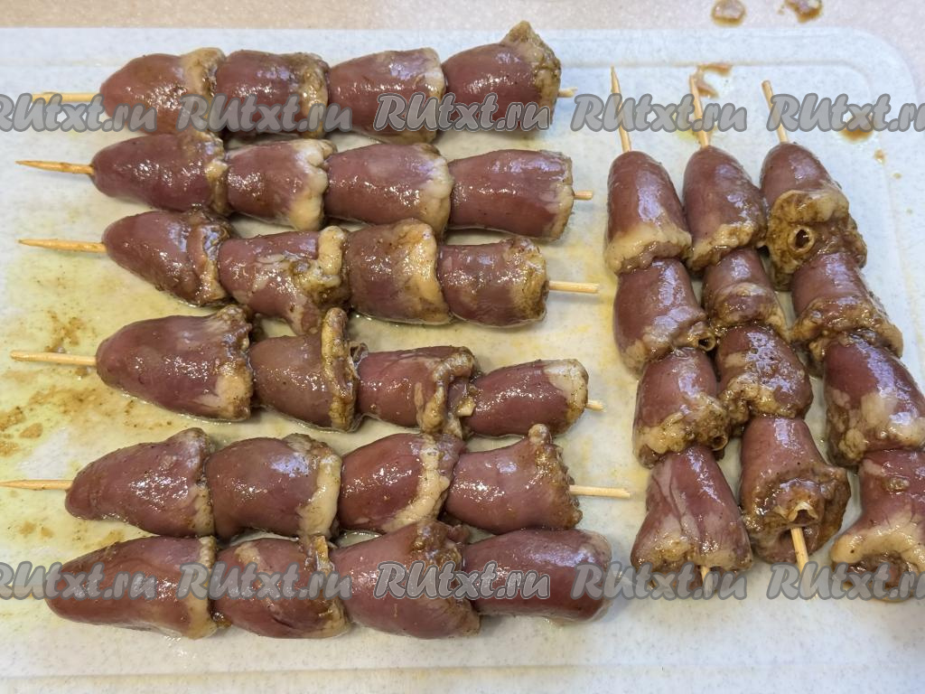 Минут за 10-15 до окончания маринования сердечек, нужно взять деревянные шпажки, на которые вы в дальнейшем будете нанизывать сердечки, выложить их в отдельную ёмкость залить полностью водой. Оставить шпажки в воде минут на 10-15 - это делается для того, чтобы шпажки не подгорали в процессе запекания сердечек в аэрогриле. Замаринованные сердечки нанизать на деревянные шпажки. У меня получились 9 шашлычков.