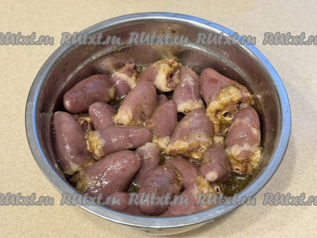 Хорошо перемешать сердечки, покрывая их соусом, специями и растительным маслом со всех сторон. Соль я не добавляла, потому что соевый соус достаточно солёный. Отправить миску с сердечками промариноваться в холодильник на 1 час, в течение этого времени сердечки нужно будет 2-3 раза перемешать, чтобы они равномерно пропитались соусом и специями.