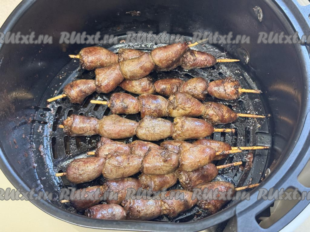 В процессе запекания нужно каждые 3-4 минуты вынимать чашу из аэрогриля, переворачивать шашлычки из сердечек, чтобы они равномерно запеклись и не пригорели.
