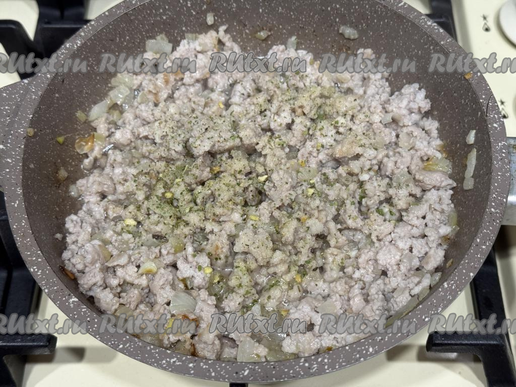 Жарить фарш минут 12-15 (до готовности мяса), достаточно часто разбивая комочки мяса, в конце жарки посолить и поперчить по вкусу (можно использовать и другие специи на ваш выбор). Готовый фарш убрать с огня.