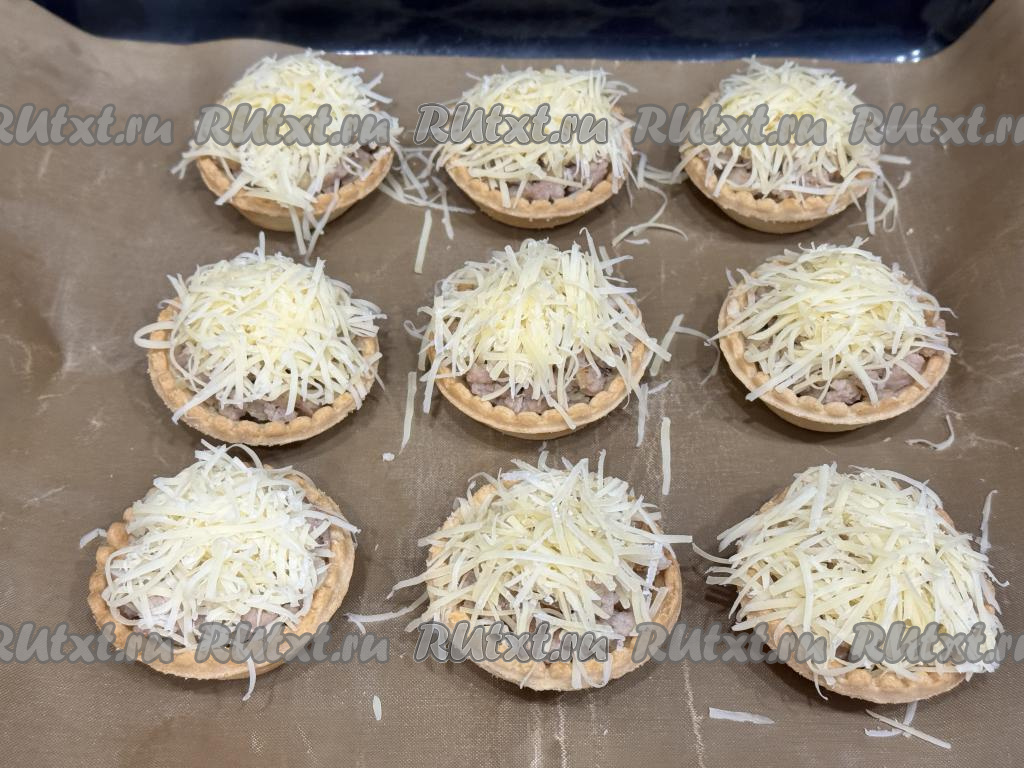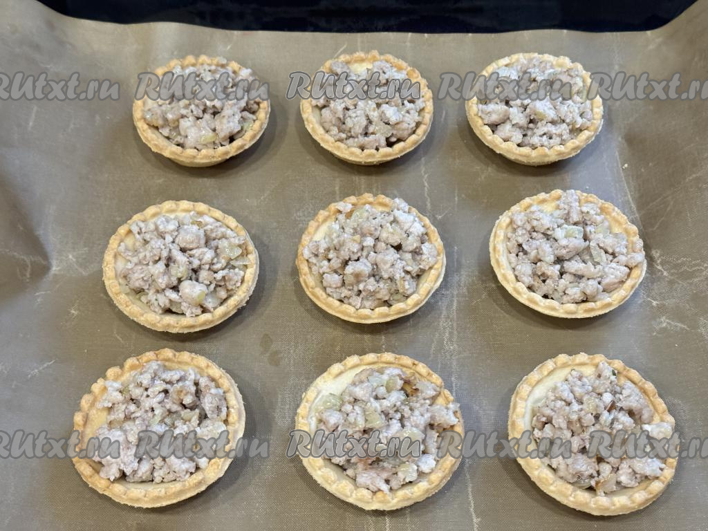 Тарталетки поставить на противень, застеленный ковриком (или пергаментом). Разложить фарш по тарталеткам, заполняя их полностью.