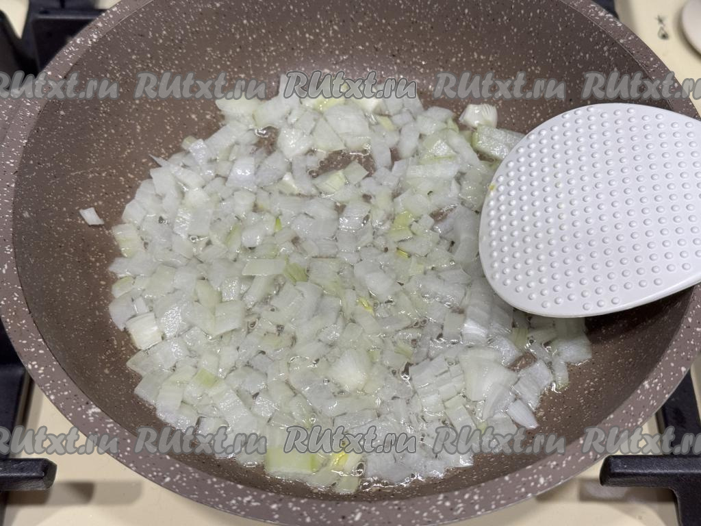 Влить в сковороду растительное масло, дать ему прогреться на достаточно сильном огне, уменьшить огонь до среднего, выложить мелко нарезанный лук, обжарить его на растительном масле до прозрачности (в течение 4-5 минут), иногда помешивая.