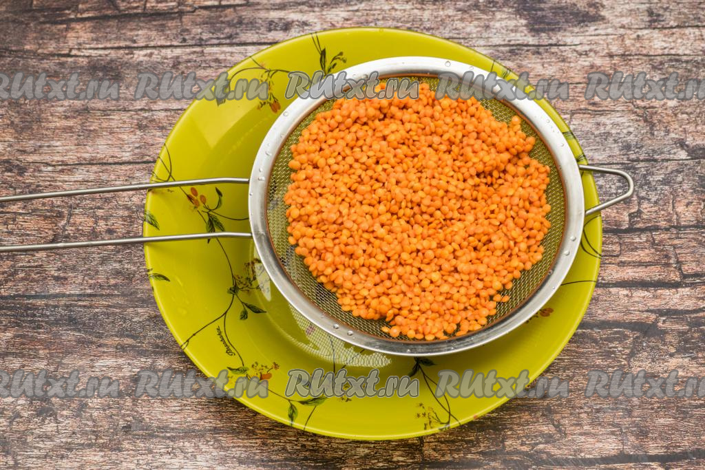Пока бульон закипает, чечевицу (у меня - красная чечевица) выложить в сито, тщательно промыть под проточной водой. Затем дать стечь лишней воде с чечевицы.