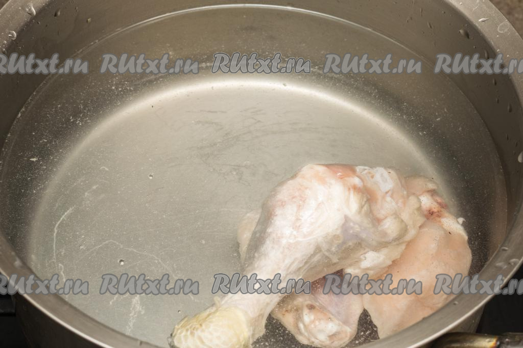 Части курицы (я взяла крыло и голень) вымыть, выложить в кастрюлю, в которой будете варить чечевичный суп, влить 2 литра воды, поставить на достаточно сильный огонь. С поверхности закипевшего бульона убрать пену, снизить огонь до минимума, варить мясо минут 25-30. После того как мясо сварится, убрать кастрюлю с огня. Части курицы достать из бульона, выложить на тарелку, оставить остывать. Бульон, если необходимо процедить, а затем вернуть его в кастрюлю, поставить на огонь. Дать бульону закипеть.
