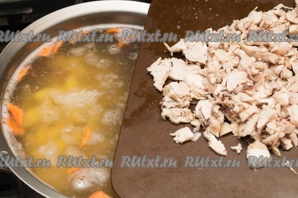 Добавить мясо, отделённое от костей, и, по желанию, нарезанное на части. Довести чечевичный суп до кипения, посолить по вкусу, уменьшить огонь, варить минут 15.