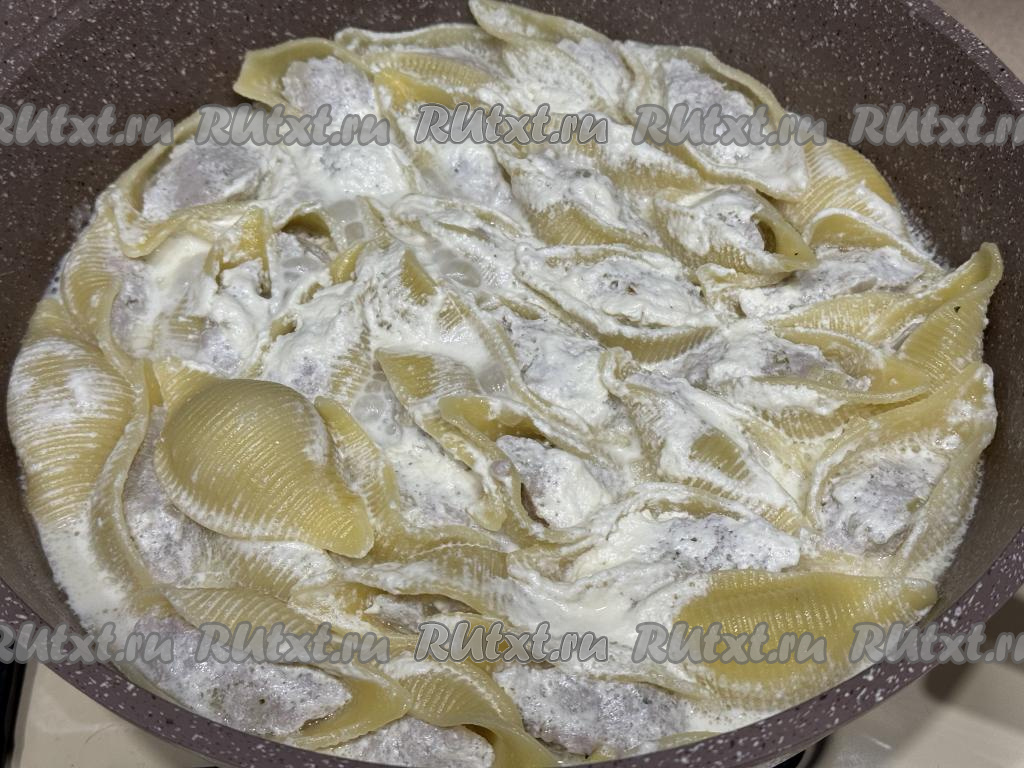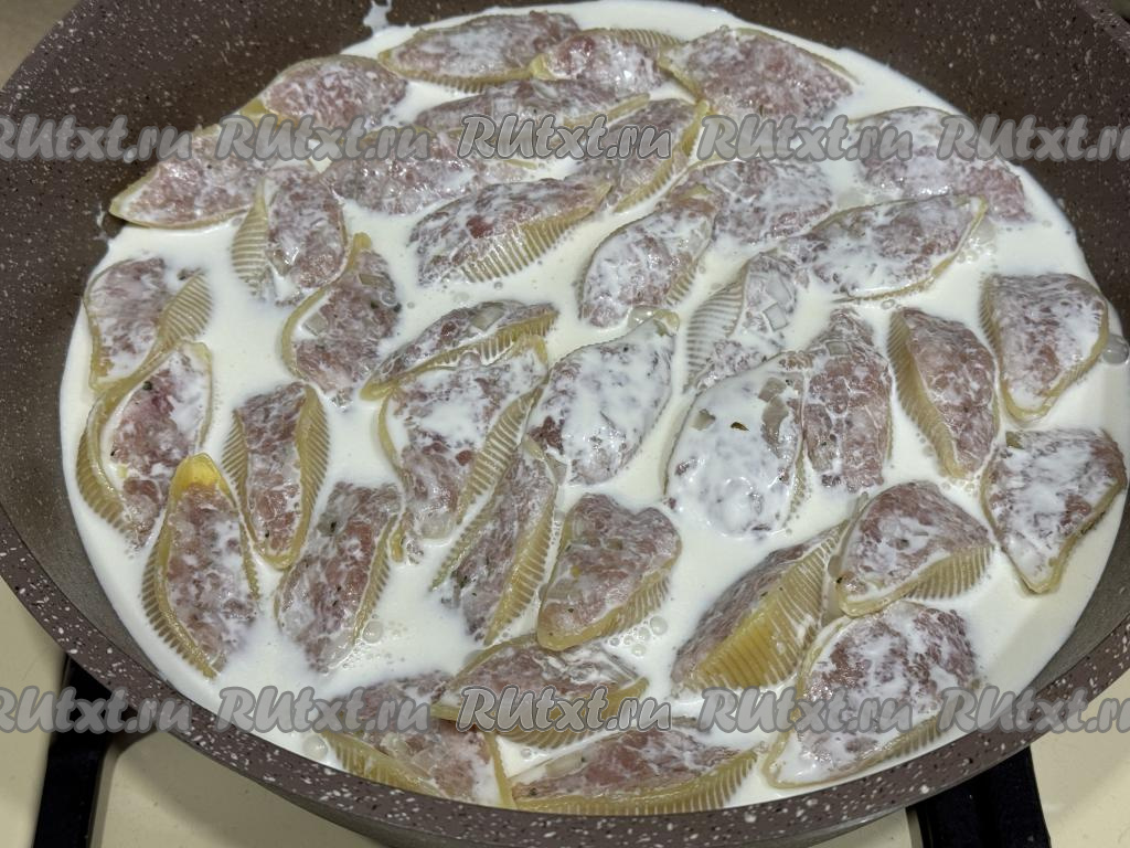 Влить сливочный соус в сковороду к ракушкам с фаршем. Соус должен практически полностью покрывать макароны. Если необходимо, добавьте ещё немного воды, в этом случае соус нужно будет немного подсолить. Сковороду с фаршированными ракушками поставить на огонь выше среднего.