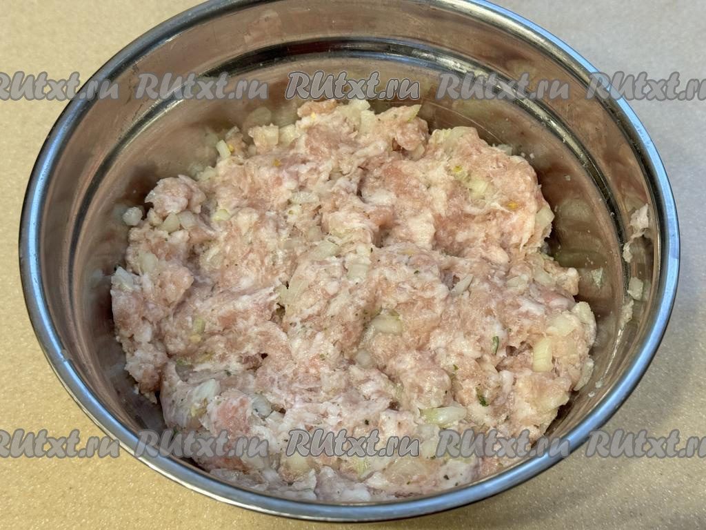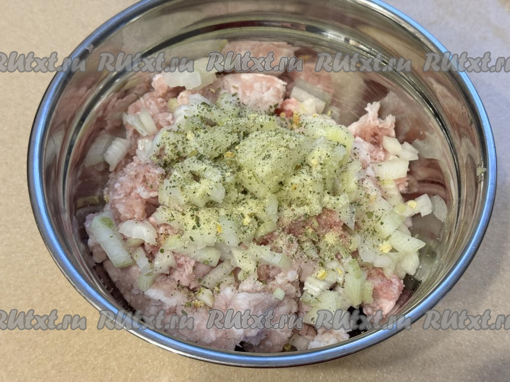 В миску с фаршем добавить лук, посолить и поперчить по вкусу.