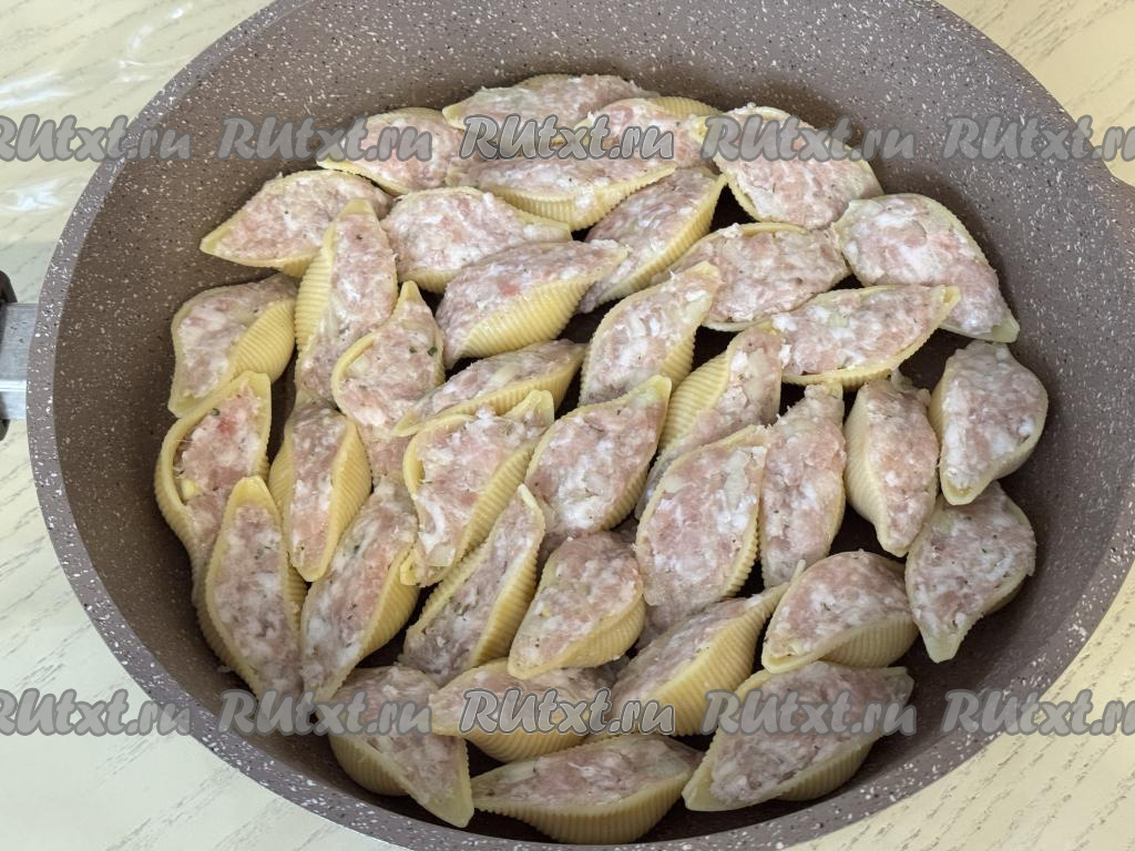 Остывшие ракушки наполнить фаршем и выложить их в объёмную сковороду в один слой.
