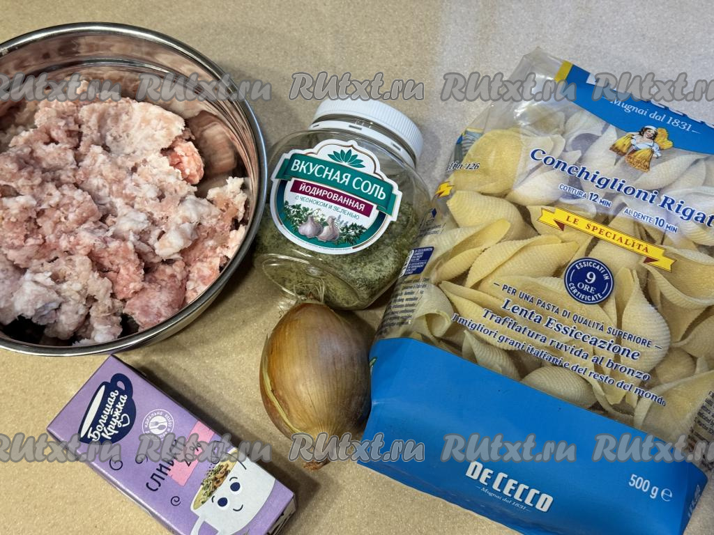Подготовить продукты. Фарш можно приготовить в домашних условиях, пропустив кусочки мяса (например, свинину, курицу, индейку) через мясорубку, но можно использовать и покупной фарш. В этот раз я приготовила фарш из свинины. Ракушки нужны крупные, чтобы можно было положить в них достаточное количество фарша. Сливки лучше всего взять жирностью 10-20% (я купила жирностью 20%).