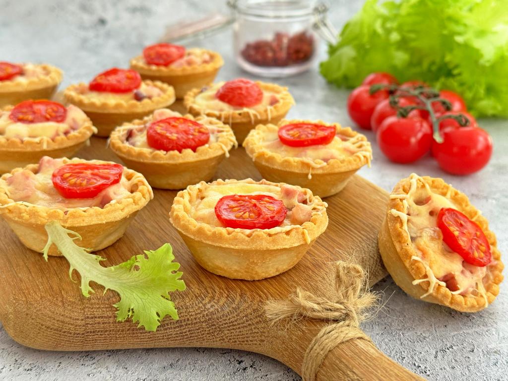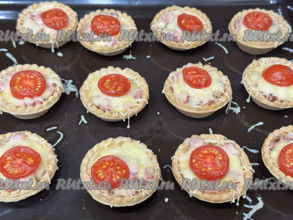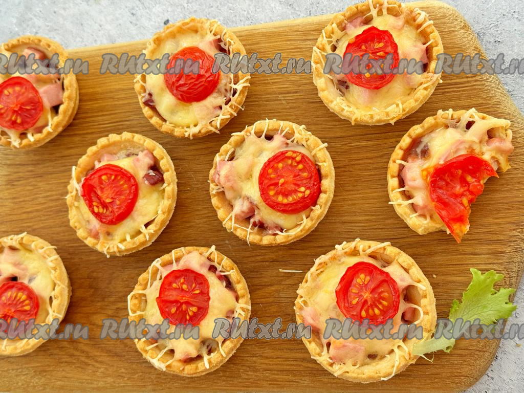 Аппетитные тарталетки с мини-пиццами достать из духовки и в горячем виде подать к столу.