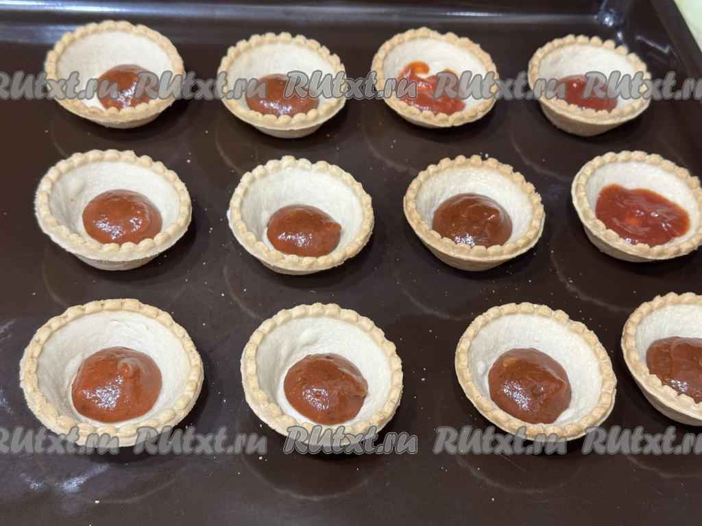 12 тарталеток поставить на противень. На дно каждой тарталетки выложить по 1 чайной ложке кетчупа.