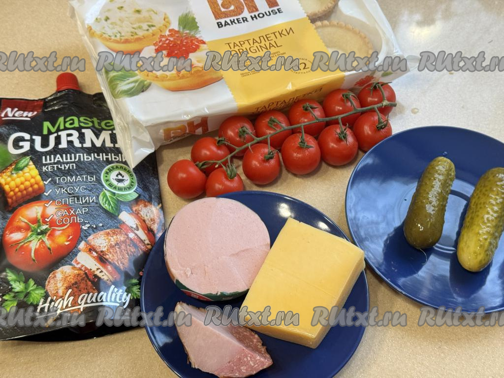 Подготовить продукты. Колбасу можно взять любую, я взяла сразу несколько видов колбас. Песочные тарталетки можно приобрести в любом продуктовом магазине.