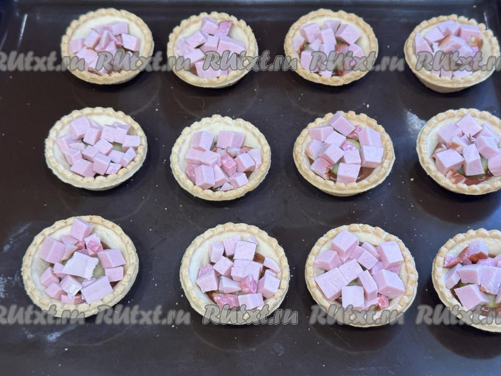 Колбасу нарезать на мелкие кубики, равномерно разложить по тарталеткам.
