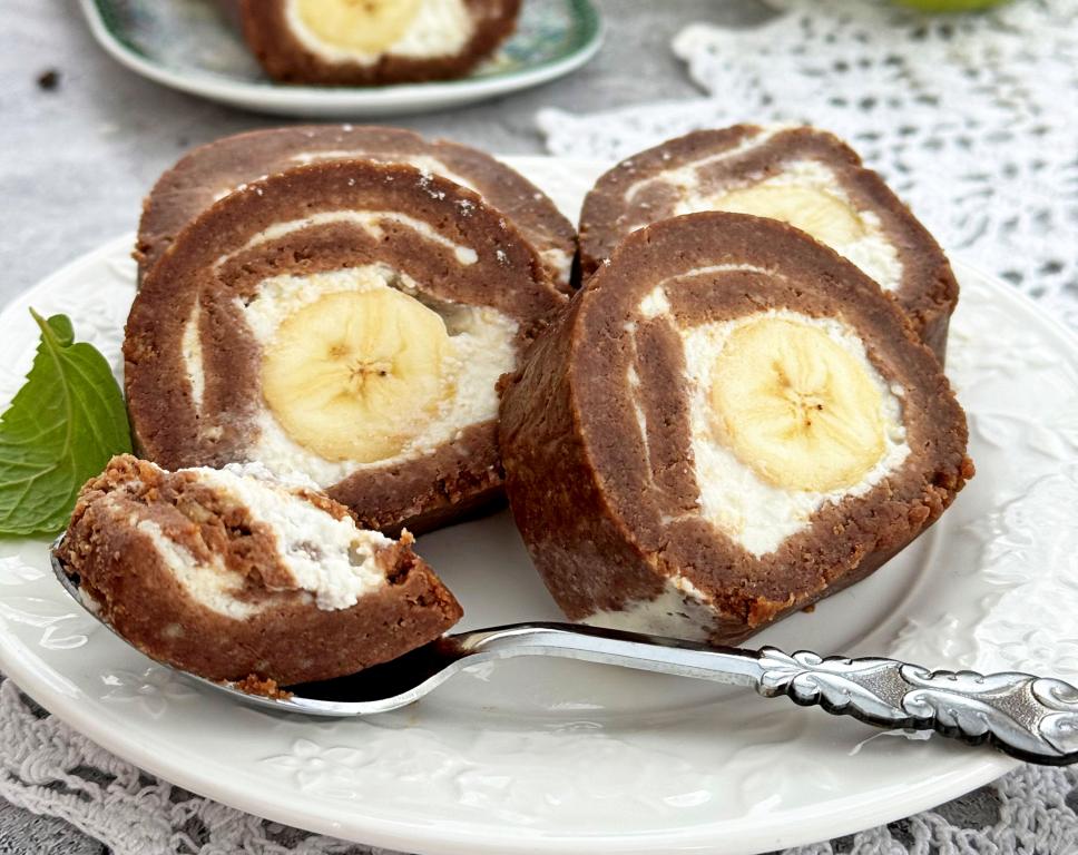 Аппетитные кусочки рулета, приготовленного из печенья и банана без выпечки, выложить на тарелку и подать вкусный, нежный десерт к столу.