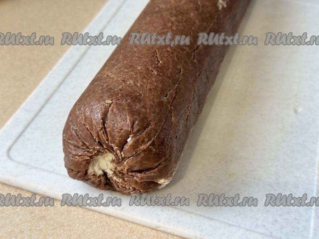 При помощи силиконового коврика (или пищевой плёнки) свернуть пласт с творожной начинкой и бананом в рулет, начиная сворачивать с более широкой стороны пласта. Переложить рулет на лист фольги. Плотно завернуть рулет из печенья и банана в фольгу, как конфету, и отправить в холодильник для стабилизации на ночь.