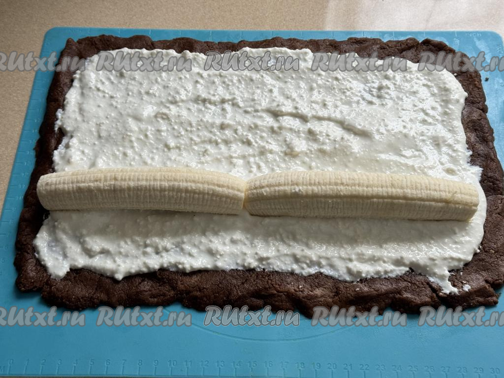 Очистить 2 банана. Поверх творожной начинки ближе к краю одной из длинных сторон пласта выложить в один ряд 2 банана, как на фото. Если необходимо, отрезать кончики бананов, чтобы они не выходили за края творожного слоя.