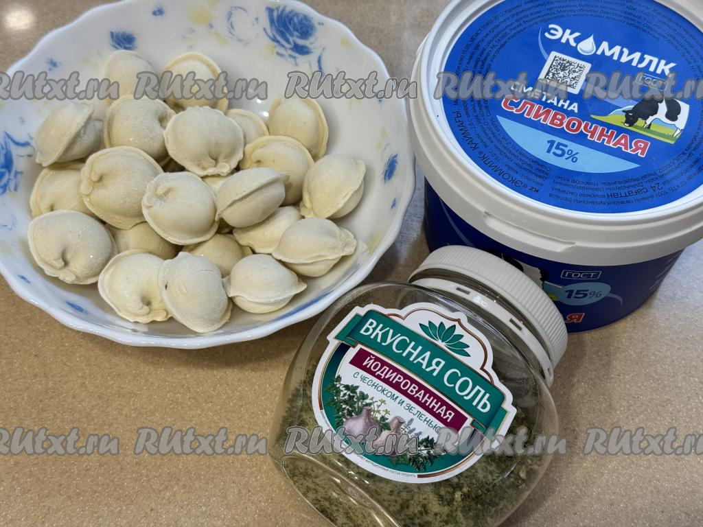 Подготовить продукты. Для этого блюда можно взять покупные замороженные пельмени, размораживать их не нужно. Сметана подойдёт любой жирности (я купила жирностью 15%).
