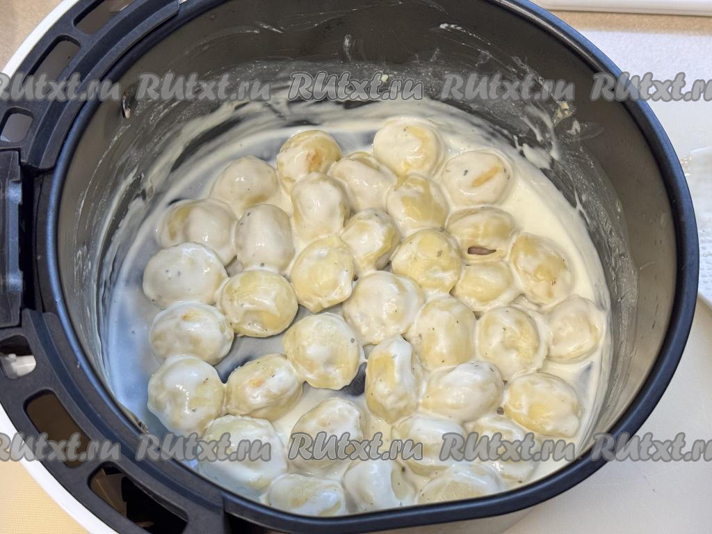 Через каждые 5 минут нужно доставать чашу и перемешивать пельмени. Я всего готовила пельмени в сметанном соусе 20 минут, но многое зависит от мощности вашего аэрогриля. Готовность пельменей можно проверить на вкус, разрежьте один пельмешек и попробуйте.