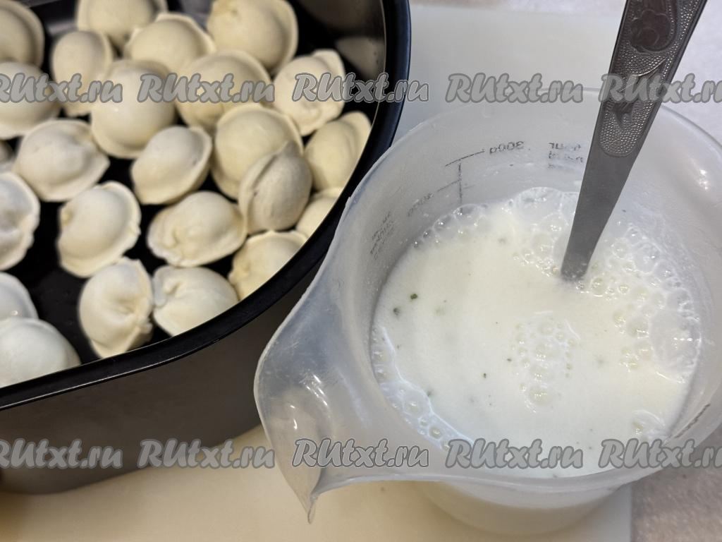 Влить получившийся сметанный соус в чашу аэрогриля к пельменям. Соус должен практически полностью покрывать пельмени, если необходимо, добавьте ещё немного кипящей воды. Чашу с пельменями в сметане отправить в аэрогриль. Выставить температуру 200 градусов, время - 20 минут.