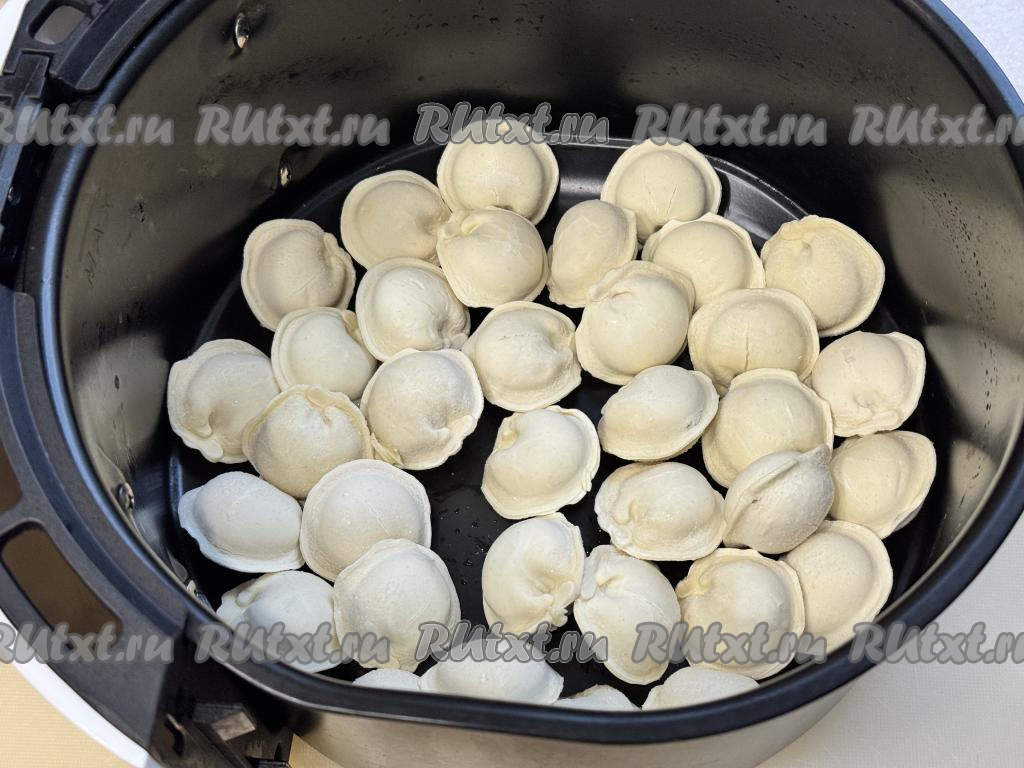 Чашу аэрогриля без решётки немного смазать растительным маслом, выложить замороженные пельмени в один слой.