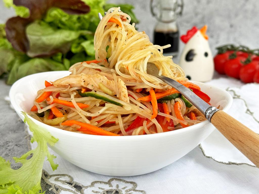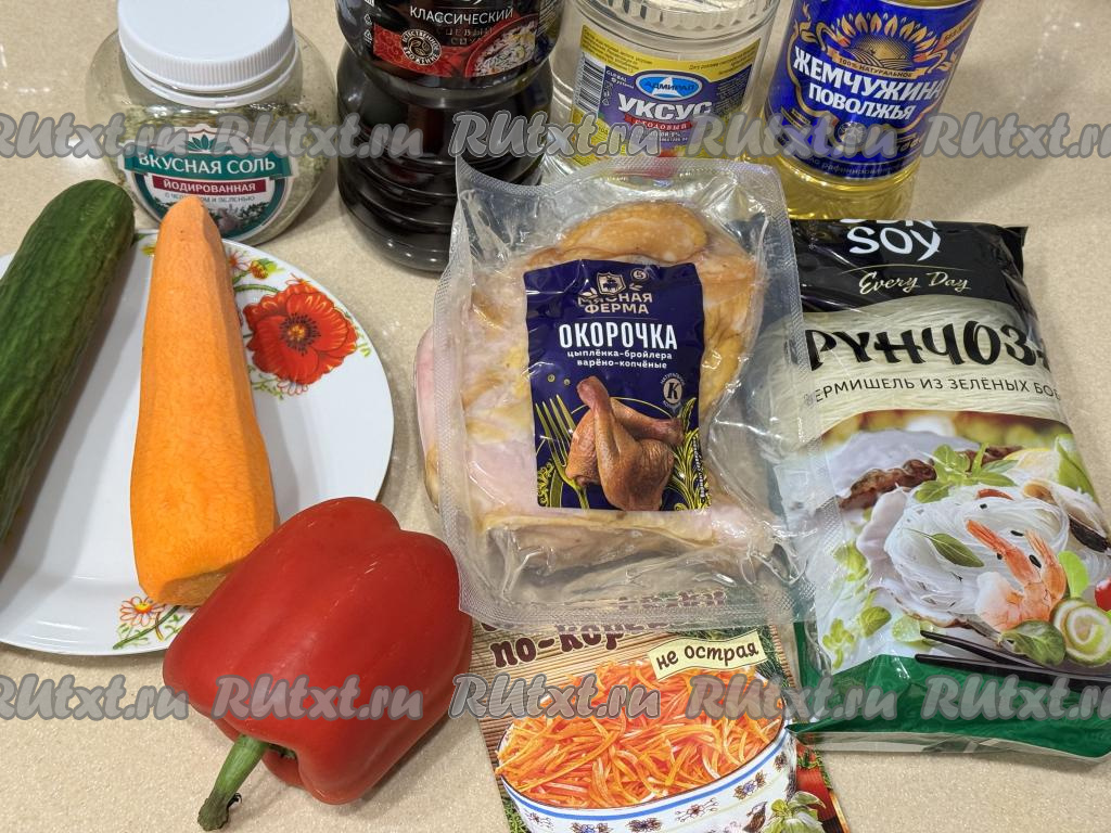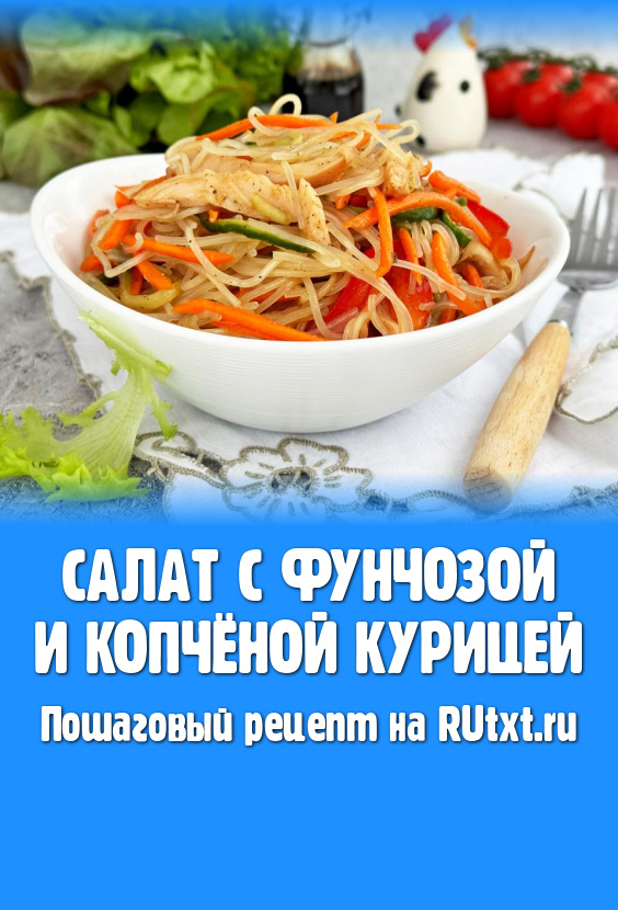 В нашей семье очень любят фунчозу и в холодном, и в горячем виде. Поэтому предлагаю приготовить салат из фунчозы с копчёной курицей. Салат получается очень вкусным, ярким, пикантным. Его можно приготовить и на обед или ужин, и на праздничный стол.