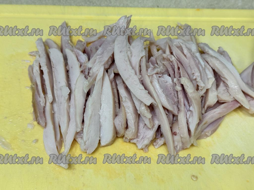 Копчёное мясо курицы (я взяла мясо с копчёного куриного бедра) нарезать на длинные брусочки.