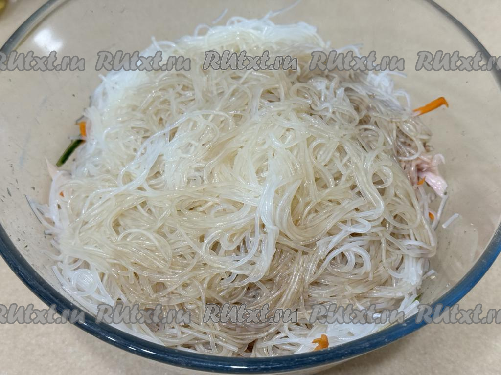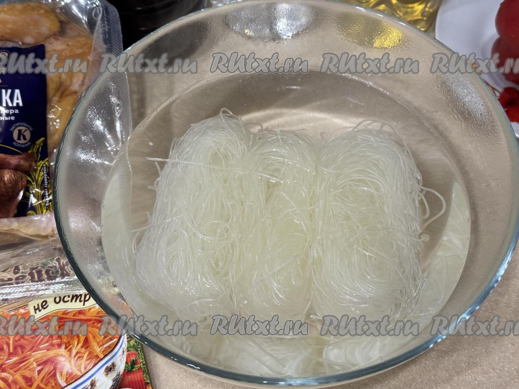 Прежде всего в глубокую миску нужно выложить фунчозу, залить её большим количеством кипящей воды и оставить на 5 минут.