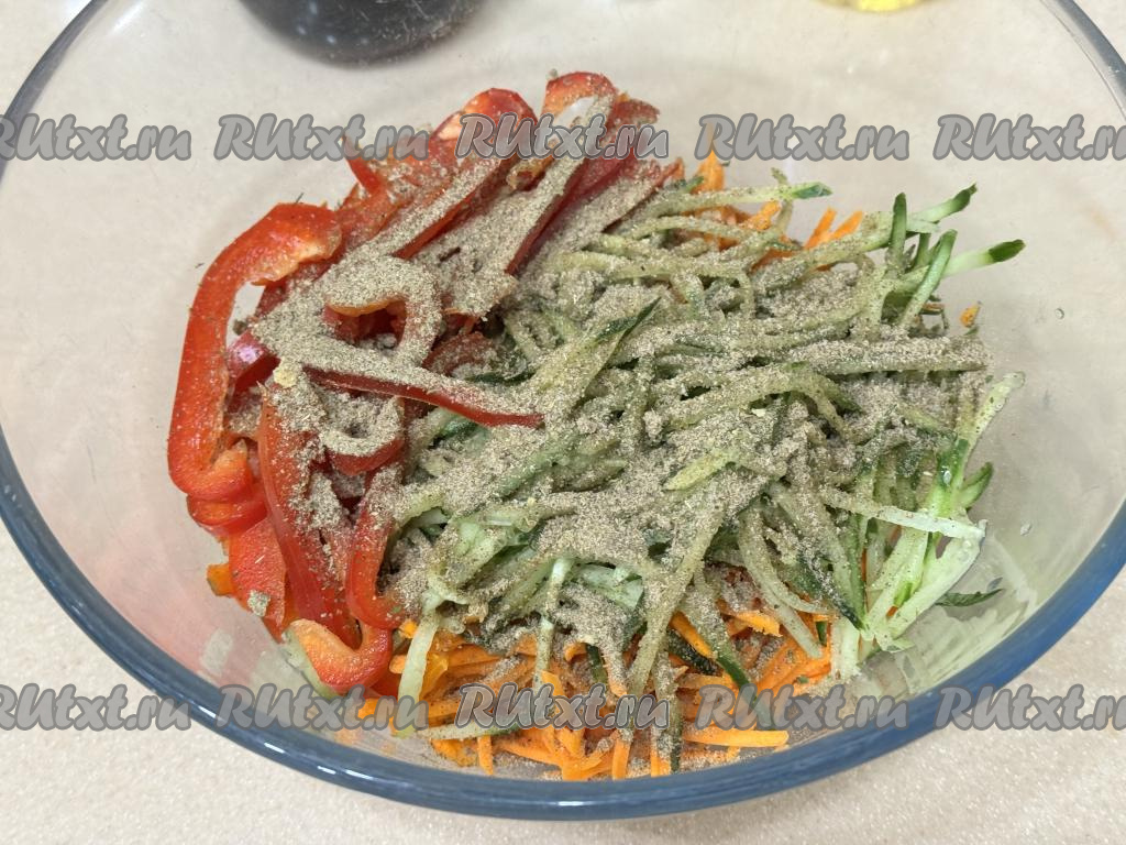 В миску с овощами всыпать специи для корейской моркови и немного соли.