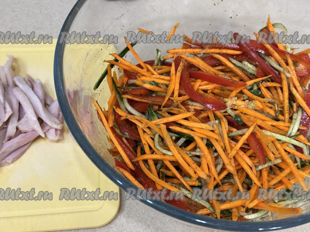 Сюда же добавить болгарский перец, нарезанный на длинные и тонкие полоски.