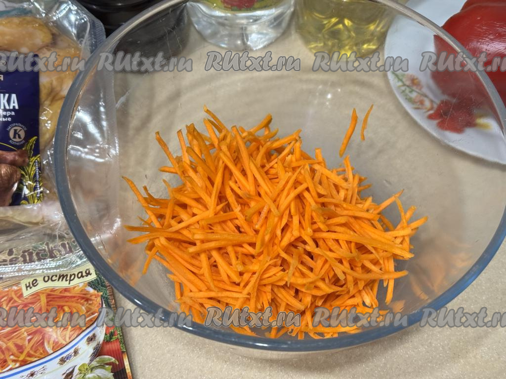 Пока фунчоза находится в кипящей воде, нужно морковь натереть на тёрке для корейской моркови (или на крупной тёрке) в достаточно глубокую миску.