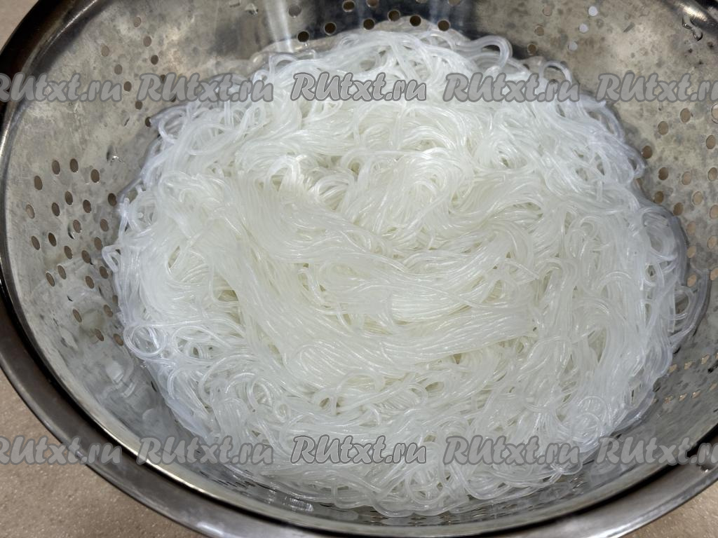 По прошествии 5 минут откинуть фунчозу на дуршлаг, промыть холодной водой, лишней воде дать стечь.