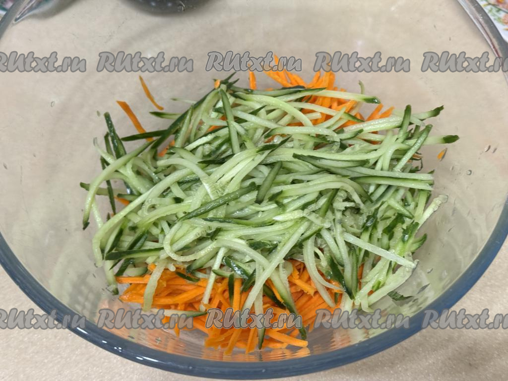 В миску с морковкой на той же тёрке натереть огурец.