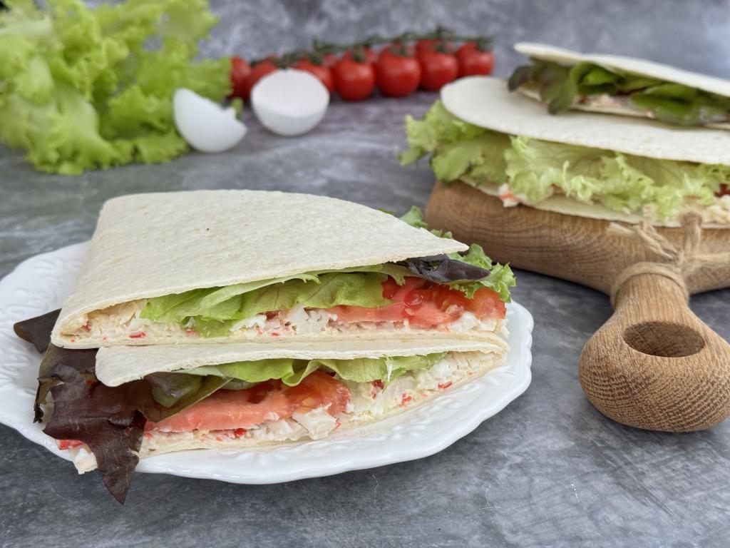 Лепёшки "Тортилья" отлично подходят в качестве основы для формирования различных закусок. В этот раз предлагаю взять покупные тортильи и завернуть в них начинку из крабовых палочек, майонеза и яиц, а также помидоров и листьев салата. Но при желании в начинку можно добавить и болгарский перец, огурцы или любые другие овощи, которые есть у вас дома. Тортильи с крабовыми палочками получаются сытными и вкусными, а готовятся и просто, и быстро. Они станут отличным завтраком или перекусом для вас и ваших близких!
