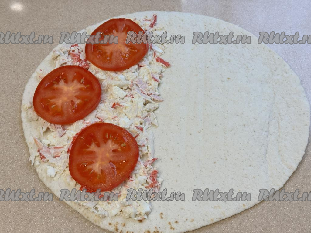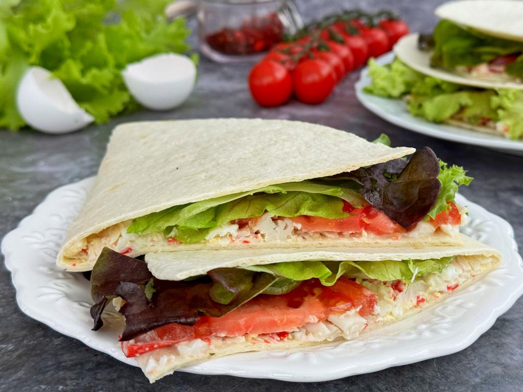 Таким же образом сформировать ещё 3 тортильи с начинкой из крабовых палочек, яиц, помидоров и листьев салата.
