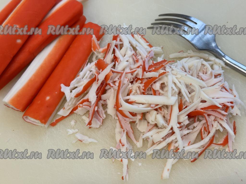 Крабовые палочки вынуть из упаковки, тонко нарезать или с помощью вилки разделить на тонкие полоски.