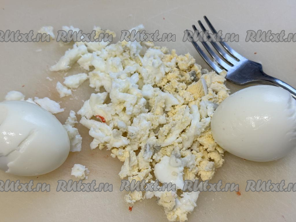 Остывшие варёные яйца почистить и размять вилкой.