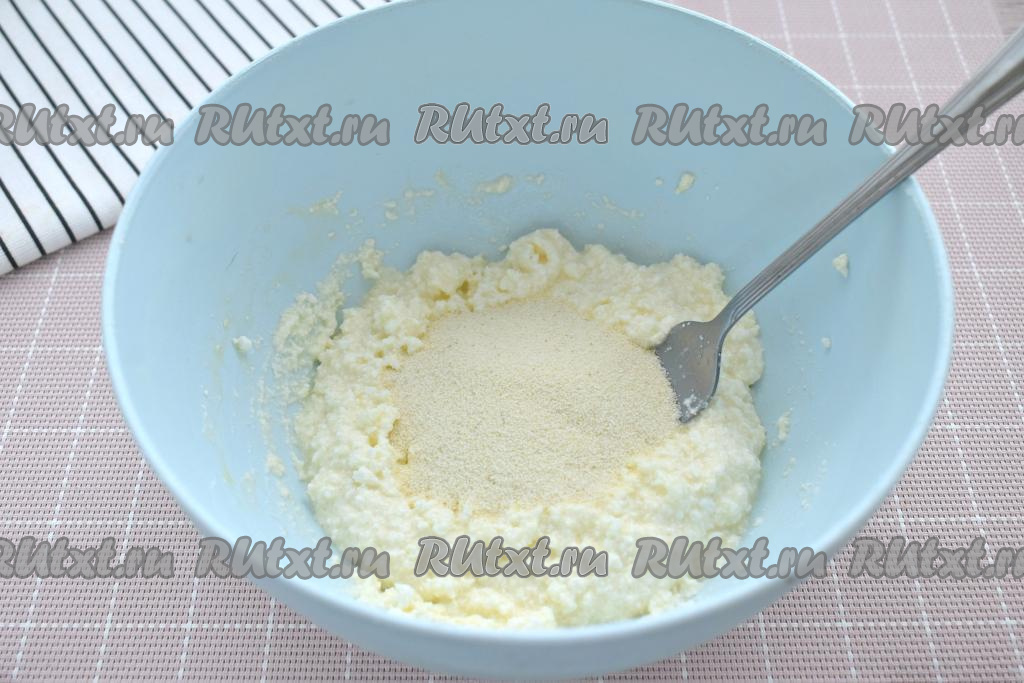 В получившуюся однородную творожную массу всыпаем 1 столовую ложку манки, тщательно перемешиваем, всыпаем ещё 1 столовую ложку манки, снова хорошо перемешиваем.