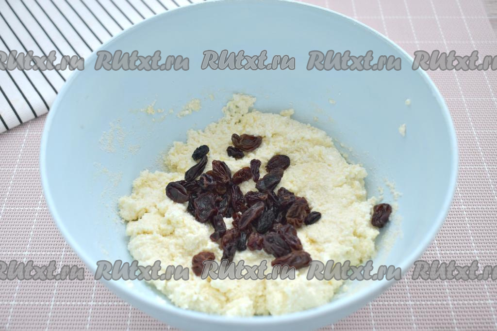 Творожное тесто для сырников должно быть вязким, в меру густым, как на фото, оно должно держать форму, если слегка сжать его в ладони. Если необходимо, добавьте ещё 0,5-1 столовую ложку манки, добиваясь нужной консистенции теста для сырников. Я для получения творожного теста нужной густоты добавила в общей сложности 3 столовых ложки манки. В миску с получившимся творожным тестом выкладываем обсушенный изюм, перемешиваем. Миску с творожным тестом с изюмом накрываем полотенцем и оставляем на 15 минут, чтобы манка немного набухла.