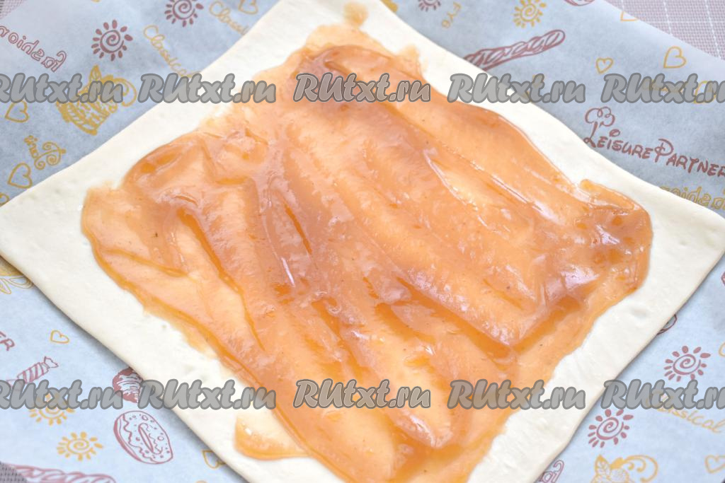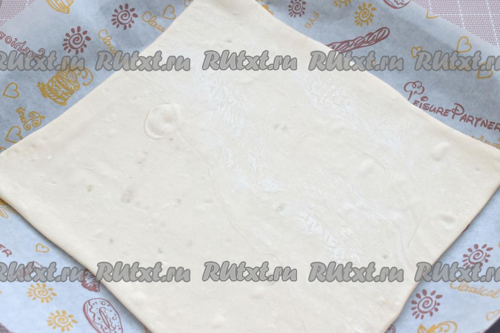 На рабочую поверхность, слегка присыпанную мукой, выкладываем первый размороженный пласт слоёного теста, раскатываем его скалкой в квадрат со стороной 25 сантиметров. Раскатанное тесто перекладываем на противень, заранее застеленный пергаментом.