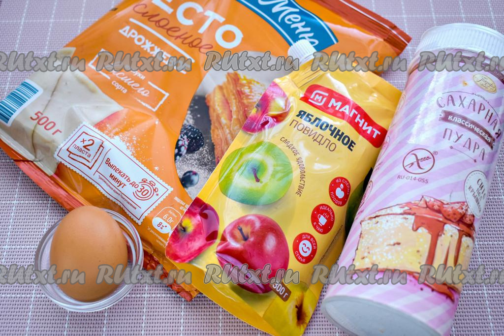 Подготовим продукты для приготовления пирога с яблочным повидлом из слоёного теста. Для формирования этого пирога подойдёт как слоёное бездрожжевое тесто, так и слоёное дрожжевое тесто (я купила дрожжевое). Тесто у меня было в 2 квадратных пластах с размером стороны 17 сантиметров.  Размораживаем слоёное тесто при комнатной температуре.