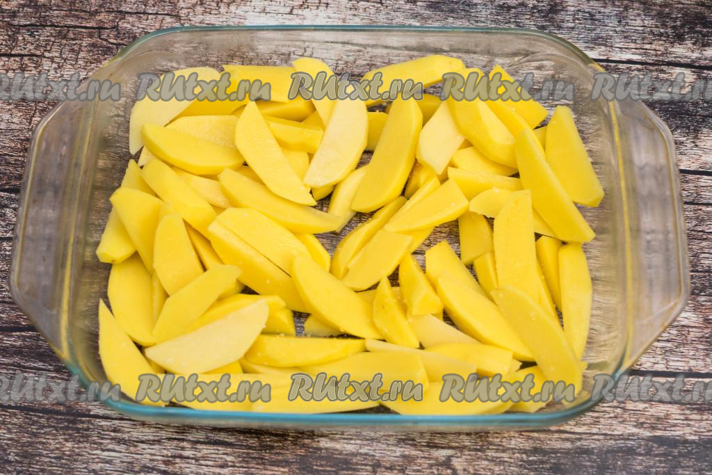 Картошку тоже очистить, промыть водой, нарезать на средние дольки. Выложить нарезанную картошку в форму для запекания.