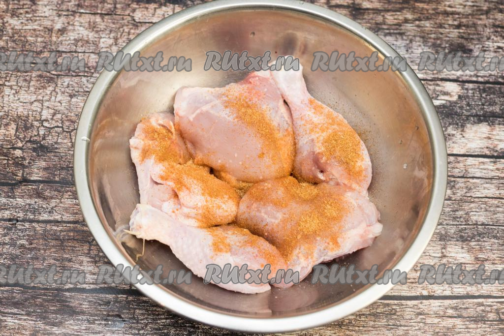 Части курицы переложить в миску, посолить, приправить специями (я использовала специи для курицы и индейки). Тщательно перемешать, покрывая курочку специями и солью со всех сторон.