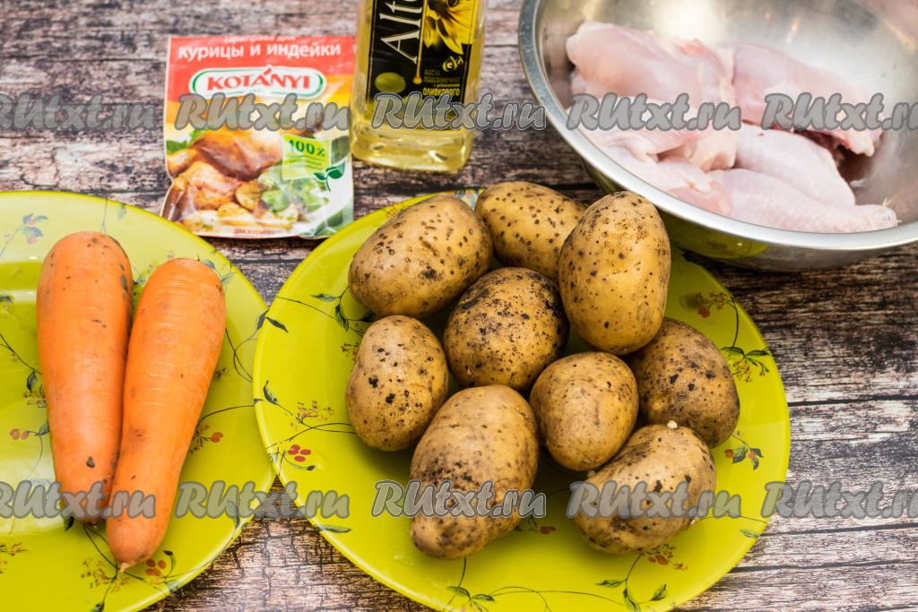 Духовку разогреть до 200 градусов, затем отправить в неё форму с картошкой, морковкой и курицей. Запекать примерно 60-70 минут.