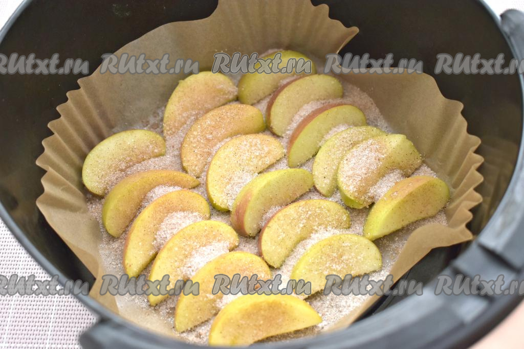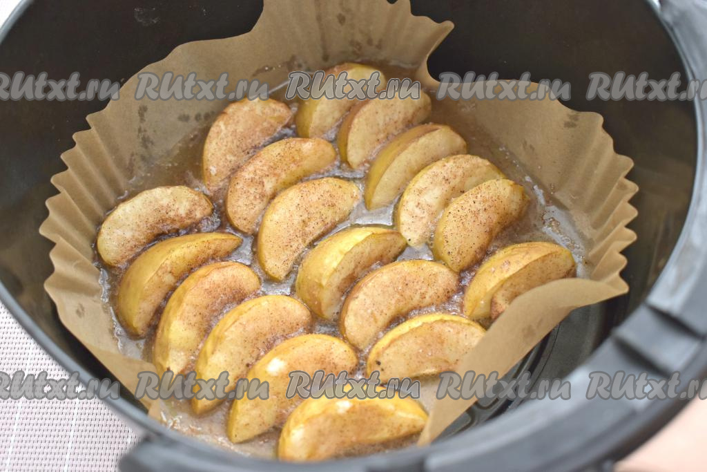 Чашу аэрогриля застилаем пергаментом, выкладываем дольки яблок в один слой.