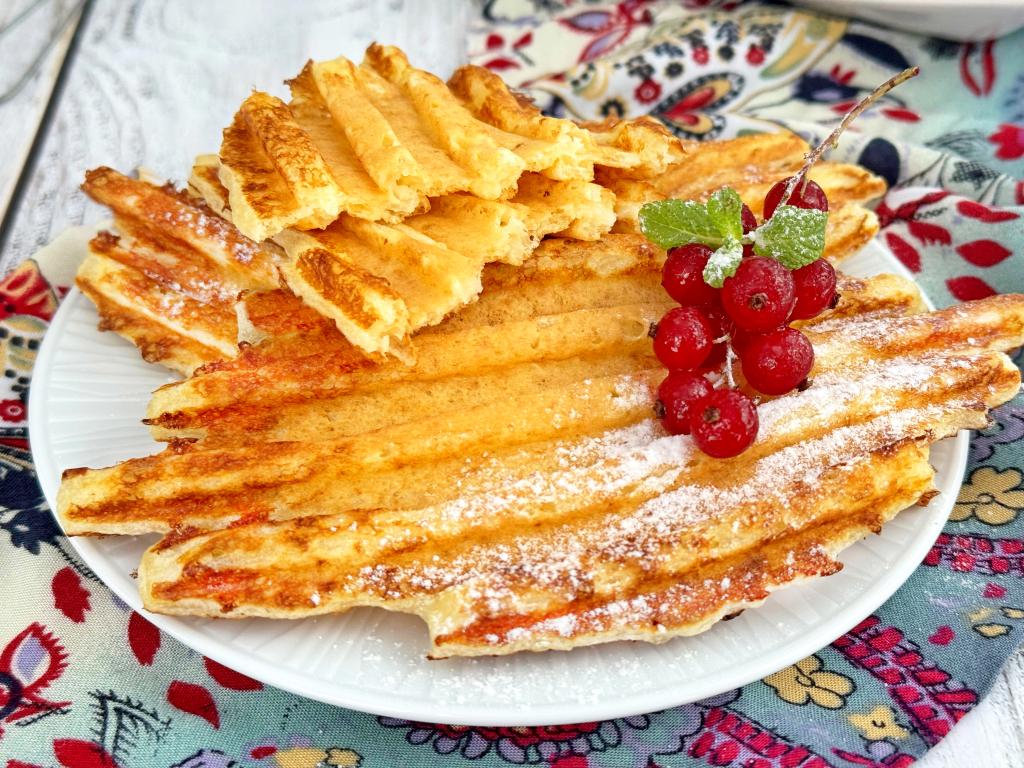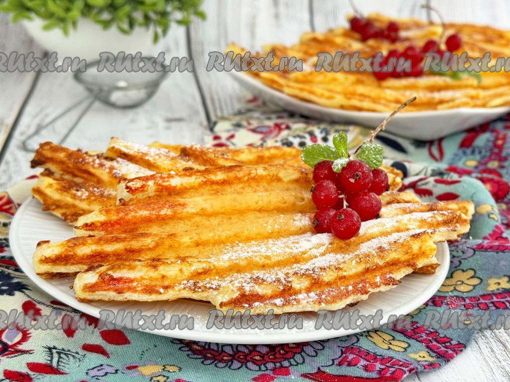 Нежные, вкусные, слегка хрустящие творожные вафли, приготовленные в аэрогриле, подать к чаю, кофе.