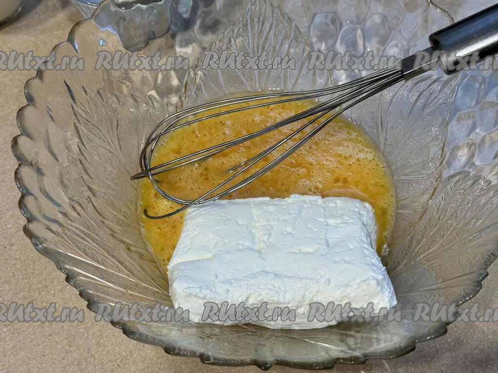 Творог можно использовать любой жирности (я купила жирностью 5%). В достаточно объёмную миску вбить яйца, всыпать сахар, соль и ванильный сахар, перемешать массу венчиком. Затем добавить творог.