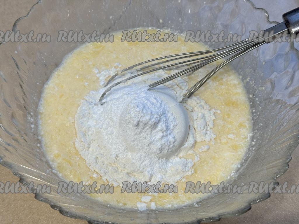 Всыпать 50 грамм муки и весь разрыхлитель, перемешать венчиком.