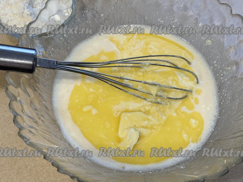 Сливочное масло слегка растопить (до жидкого состояния можно не растапливать). Я растопила в микроволновке. Дать маслу немного остыть, влить в миску с творожной смесью, перемешать венчиком.